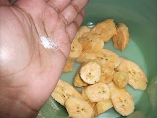 - Place them in a bowl and sprinkle on a few dashes of salt. Toss the plantains and let them sit while the oil heats.
