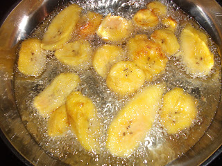 - When the oil is really hot, place the plantain in the oil in a single layer. *Mine started to stick to the bottom of the pan so you may want to move them around a bit when you first put them in the oil.*
