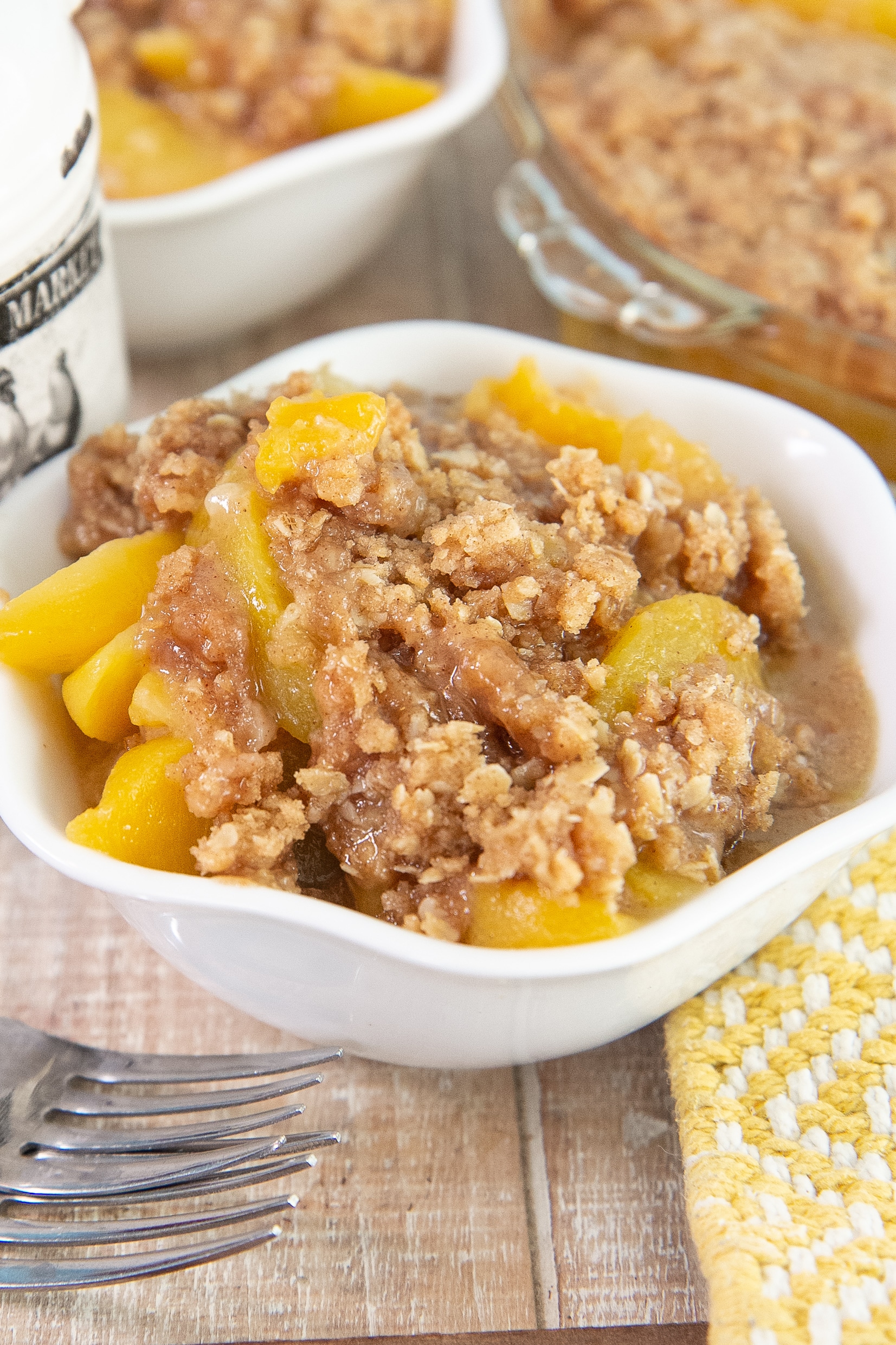 Southern-Style Peach Crisp with a cinnamon-oats topping! A rustic, down-home dessert made with simple ingredients!