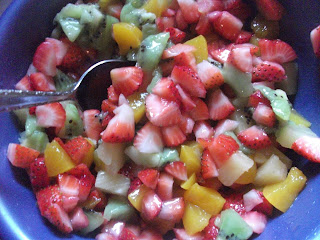 - Dice up the strawberries, pineapples, peaches and kiwi.